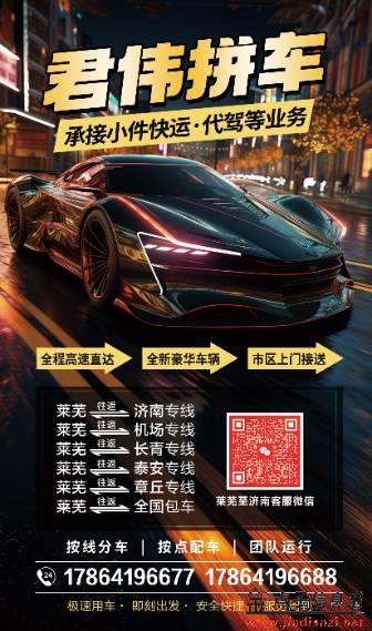 莱芜君伟拼车!! 上门接送,全程高速 豪华新车,准时高效 电话一响,即刻出发 业务介绍: